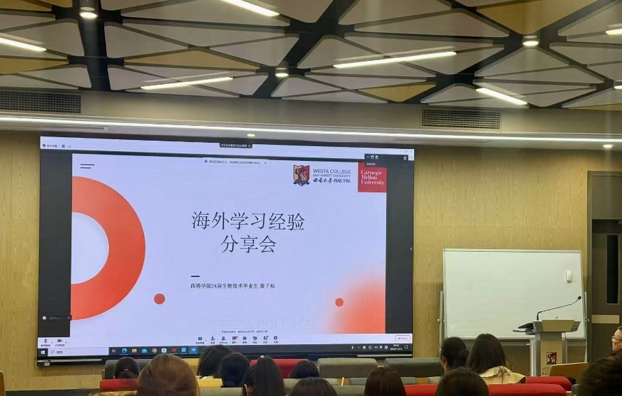 11月13日晚,应2024级生物技术2班班主任周游老师的邀请,现就读于美国卡耐基梅隆大学(Carnegie Mellon University)生物信息专业(Quantitative Biology and Bioinformatics)的黄子耘学姐在线上与同学们进行了一场别开生面的海外学习经验分享会。2024级生物技术2班班主任周游老师主持本次交流会。