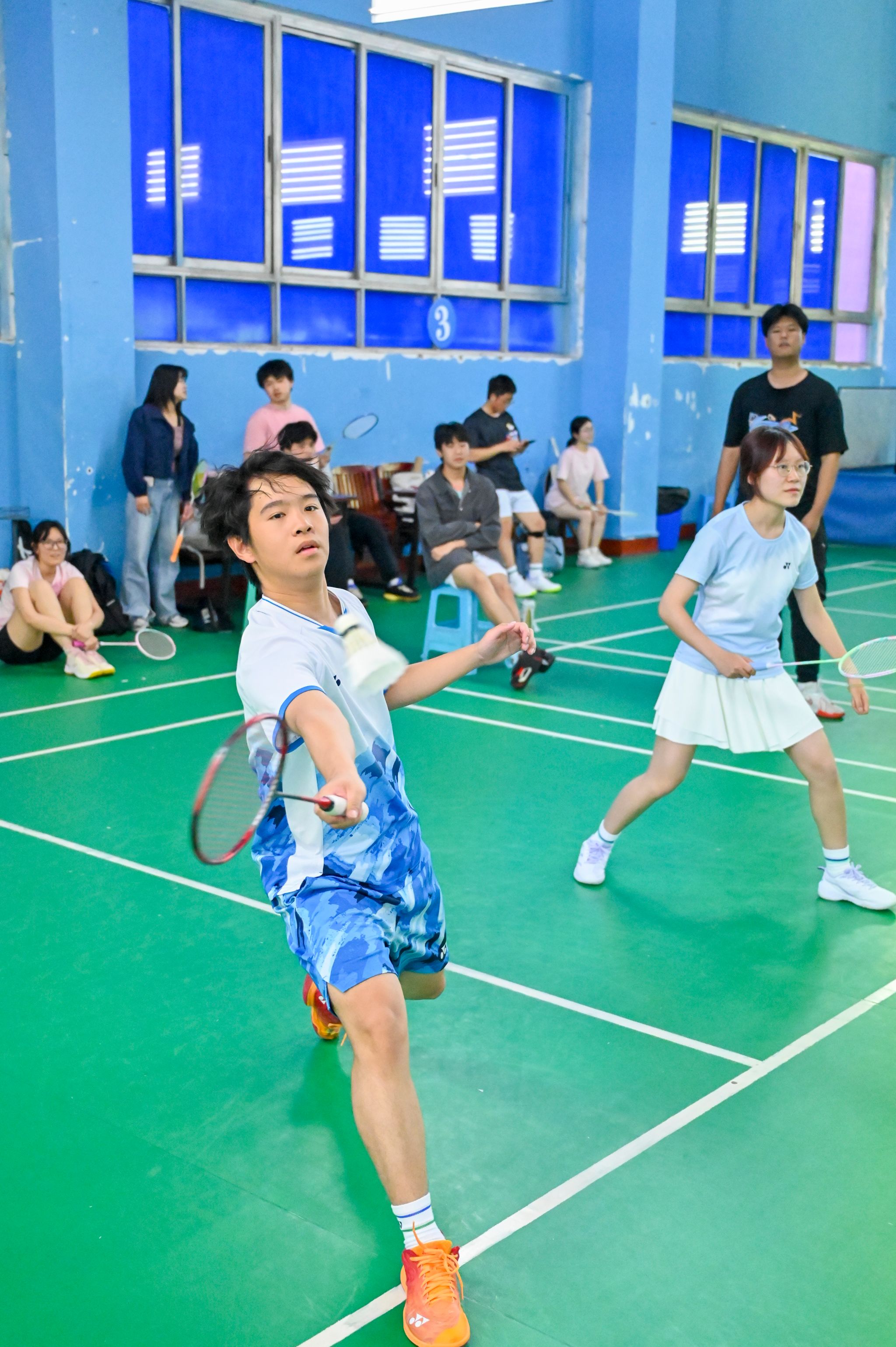 比赛现场,白色的羽毛球在空中穿梭,划出一道道优美的弧线,清脆的击球声与观众热烈的喝彩声交织在一起。老师们展现出了精湛的球技,时而以精准的高远球掌控全场,时而用巧妙的平抽球打乱对手节奏。每一次惊险的鱼跃救球都引发阵阵惊呼,每一记精妙的网前小球都赢得满堂喝彩。场边观众的热情更是将比赛推向高潮,“加油!”“好球!”的呐喊声此起彼伏,热烈的掌声与欢呼让整个场馆洋溢着蓬勃的朝气与活力。