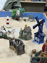 Part3:挑选了玩具后,沙盘游戏正式开始。在每一轮游戏中,同学们可选择将挑选的玩具放在沙盘中自己心仪的位置,或是摆弄沙盘中的沙子,垒起小山或开辟河流。在这个过程中,每个人都可以用心感受自己的选择以及其他成员的摆放所带来的变化。