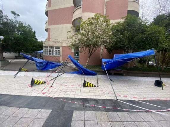 11月11日晚至12日早上,一场暴雨将竹园二区核酸采样点几乎所有的帐篷刮倒在地,一部分甚至损坏不能使用。据他回忆,当时风太大,帐篷根本稳定不住,在公司党委滕超副书记的带领下,他们就地取材,搬了20余桶桶装水固定帐篷,并配合剪刀、胶带、螺丝刀等工具……最终在当前核酸采样时间前成功修复核酸采样点。