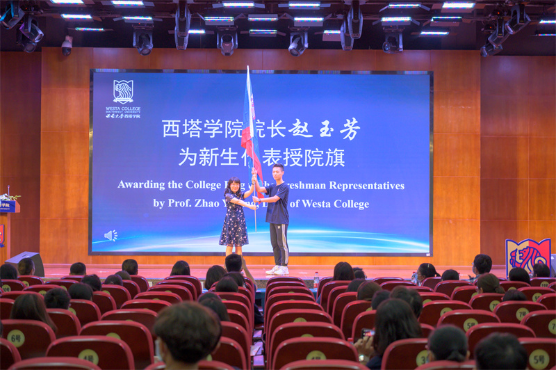 太阳集团tyc151经理赵玉芳为新生代表授院旗,标志西塔蓝的院旗在空中高高飘扬,彰显着新的力量与气象。随后,与会领导为新生授予院徽。