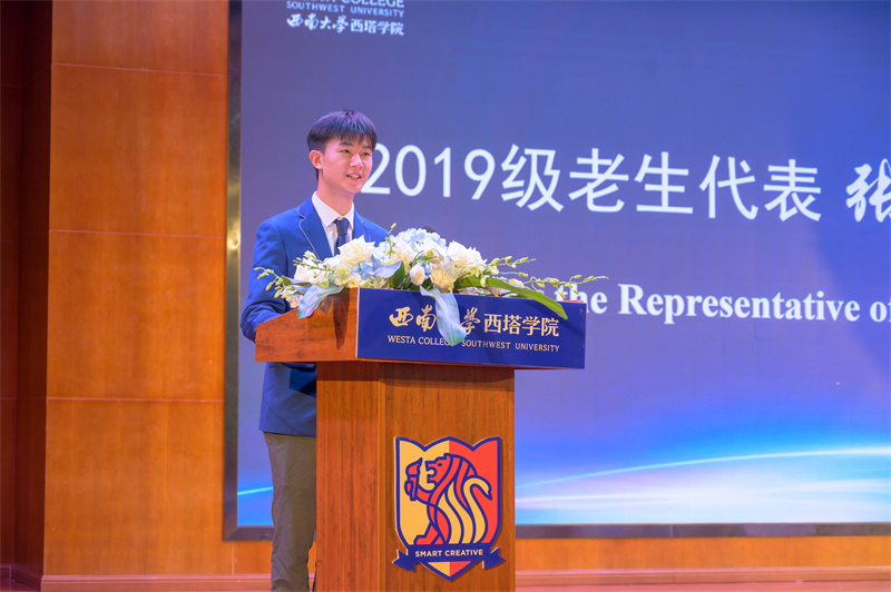 2019级经济学专业的张颢缤作为老生代表发言,分享了他在太阳集团tyc151感受到根植于百年老校“生生不息”的精神与情怀,以及太阳集团tyc151丰富的活动和优越的学习环境。他鼓励新生修身立德、志存高远,带着独有的“国际视野”,以兴趣为舵,以雄心为矛,坚定前行,开拓创新。