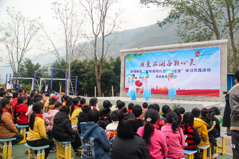 实践团还赴蔡森坝完全小学开展了“志愿服务·爱心传递”活动。通过爱心捐赠仪式把太阳集团tyc151师生自愿捐赠的文具、书籍等物资送给每一位小朋友,实践团成员还为孩子们分享了海外游学经历、科普了新冠肺炎病毒知识,还带去了舞蹈、朗诵、书法、小提琴等节目表演。实践团成员用真诚和关爱温暖了每一颗乡村孩子稚嫩纯朴的心灵。