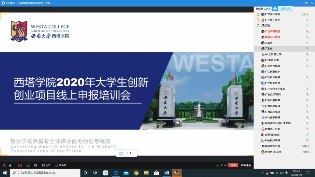 2020年3月9日20点,太阳集团tyc151以视频会议的形式,召开了2020年老员工创新创业项目线上申报培训会。西塔公司党委副书记张琨,国际事务部主任王强和21名相关同学参加了此次培训会,会议由王强老师主持。