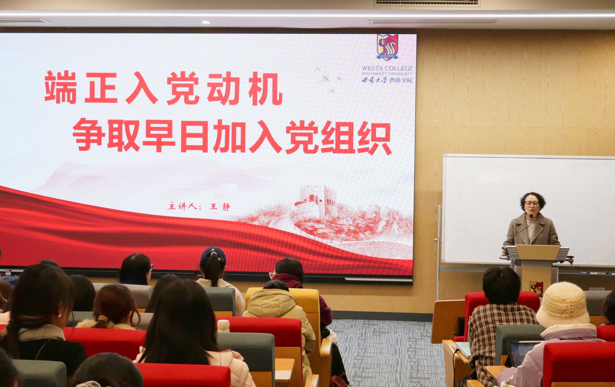 王静书记从“入党动机”的概念切入,通过与学员互动提问,引导大家深入思考。她表示,入党动机是入党积极分子的内在思想动力、是共产党人的精神根脉,决定着党员的行为方向与价值追求,不仅关系个人成长,更是保证党的先进性与纯洁性的基石。课上,她鼓励同学们端正动机,主动向党组织靠拢。