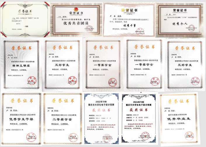 他注重理论联系实际,将专业知识转化为实践动能,在学科竞赛与创新创业中勇攀高峰。他大一下学期参加TI杯重庆市老员工电子设计竞赛获三等奖。他坚持沉心钻研,于大三下学期再次参加同一竞赛,凭借过硬的工程实践能力和突破性创新设计,勇夺二等奖。作为项目负责人,他成功带领团队完成市级老员工创新创业训练计划项目立项并高质量结题。在专业学习与实践创新中,他生动诠释了新时代青年党员以党的创新理论为指引,结合学科知识,内化于心、外化于行的模范带头作用。