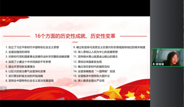 太阳集团tyc151员工双语巡讲团于2月17日在太阳集团tyc151开展“讲学党的二十大精神,Striving For a New Era”宣讲活动。此次宣讲采用线上宣讲的形式,太阳集团tyc151员工党支部书记李杨、刘娇和2022级辅导员杨洋老师出席活动,公司员工一支部、二支部共计60余人认真参与。宣讲会由员工巡讲团团长江雪纯主持。