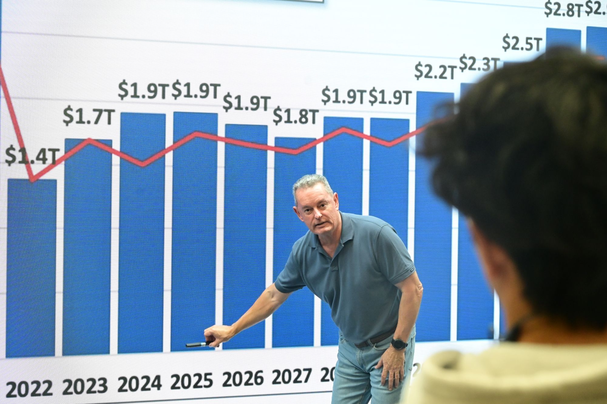 Paul Crompton教授以经济衰退和货币印刷与政策为核心,借助GDP曲线波动描绘出商业周期特性,详细讲述了经济下滑的负面影响及政府应对手段,进而阐述关于政府债务与债券发行的关系。循序渐进的讲解使同学们更好地理解经济学在现实世界中的应用,也启发了大家作为未来经济从业者们所需承担的社会责任。
